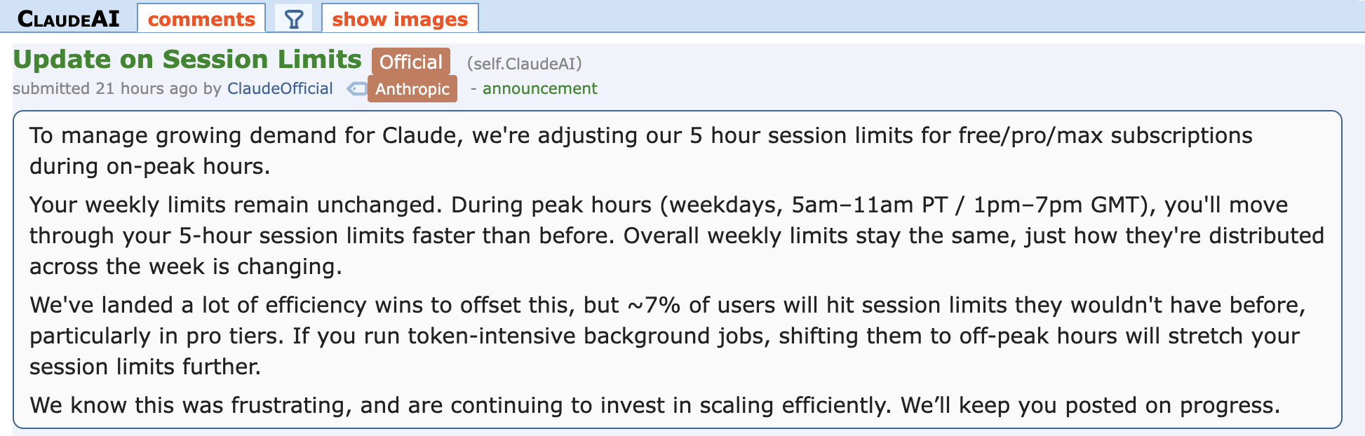 There's no reading between the lines here: this is a direct downgrade to your experience if you use CC at all during their peak hours. The "7% of users" is trying to downplay this - but due to so many companies trying to be on the leading edge or at least up with their peers, I'd be surprised if there wasn't a large amount of Claude Pro or higher tiers of paying customers not using it at all, or just for code review.